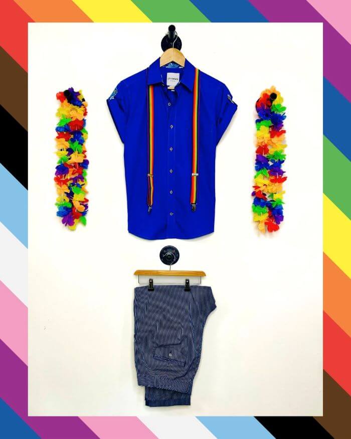 Trousers: Navy and white pinstriped trousers bring balance — relaxed but tailored, eye-catching but neutral. The tapered ankle gives a modern, clean finish, great for movement, dancing, or lounging in a park during Pride festivities.
